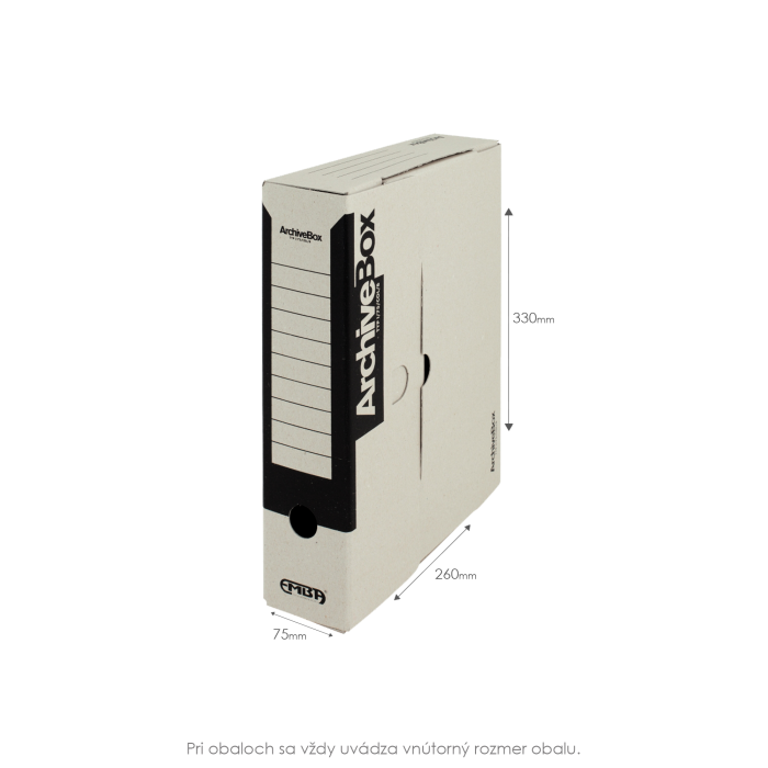 Systém archívnych boxov a škatúľ z vlnitej lepenky. Dodávané v rozloženom stave. Farba prírodná hnedá. Archívny box z hladkej ručnej lepenky, 1 000 g/ m². Konštrukčné riešenie boxu umožňuje rýchly prístup k vloženým dokumentom. Rozmery 75 × 330 × 260 mm. Väčšie balenie 25 ks. Farba čierna.