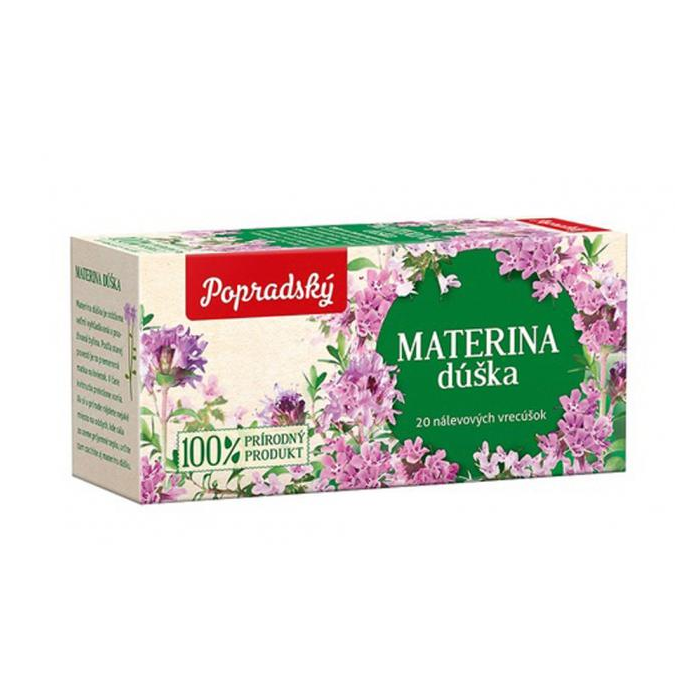 Materina dúška sa na prípravu čaju využíva už po stáročia. Vyskúšajte jedinečnú chuť nášho Popradského čaju Materina dúška a nájdite silu prírody v každom čajovom vrecúšku.