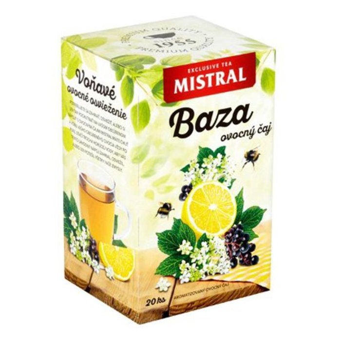 Aromatizovaný ovocný čaj s Bazou čiernou. Porciovaný v nálevových vrecúškach. Vlastnosti: Vegan, Bez laktózy, Bez gluténu.