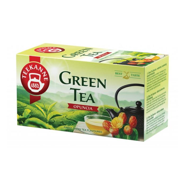 Zelený čaj Teekanne s príchuťou opuncie - lahodná čajová špecialita, ktorá spája jemnú chuť vyberaných lístkov zeleného čaju s exotickou chuťou opuncie. Balenie 20 x 1,75 g.