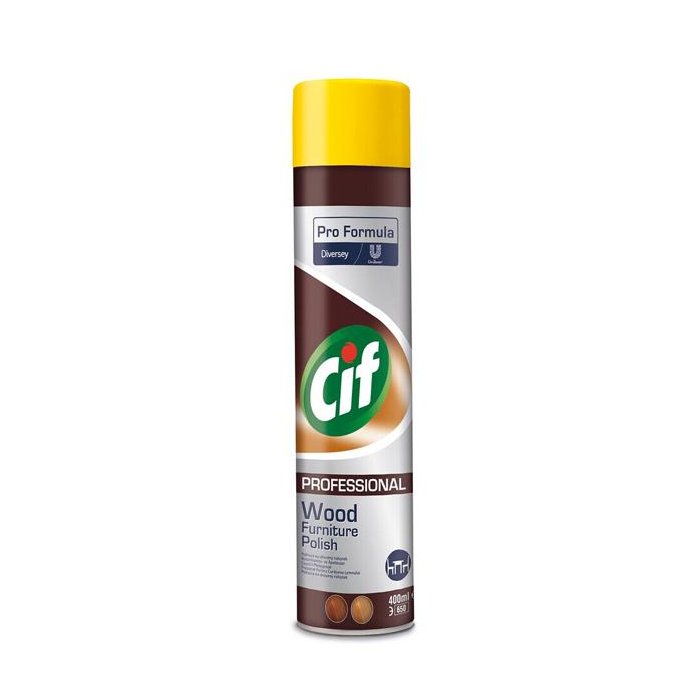 Cif Pro Formula Wood Furniture Polish je politúra na ošetrený drevený nábytok (aerosól). Odstraňuje prach a nečistoty z ošetrených drevených povrchov a zanecháva na nich vrstvu, ktorá chráni drevo pred každodenným opotrebovaním. Použitie na starožitný nábytok konzultujte s odborníkom.
