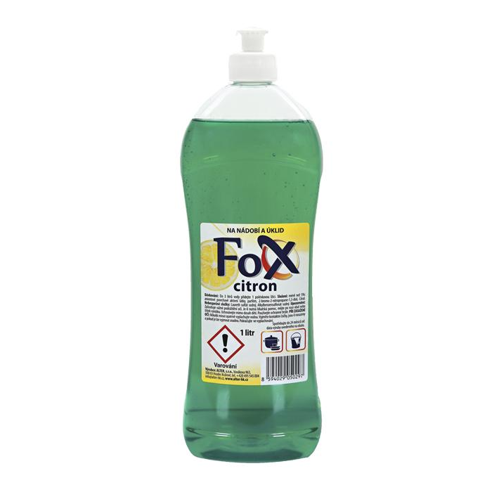 FOX citrón je prípravok na ručné umývanie riadu, parfémovaný jemnou citrónovovu vôňou. Doporučené dávkovanie prípravku je 3 pol. lyžice na 10 l vody.