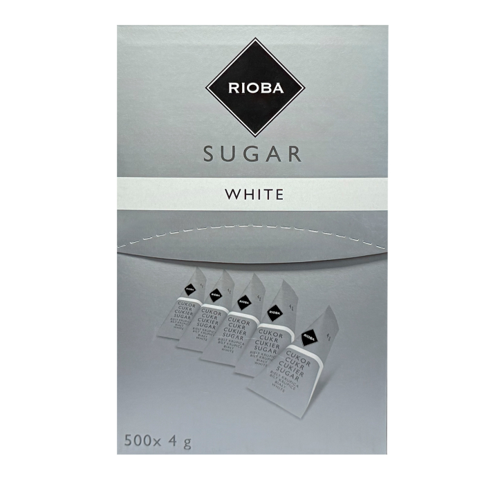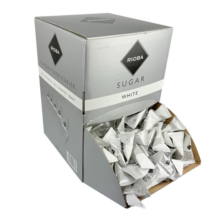 Hygienicky balený trstinový cukor s logom RIOBA, porciované po 4g.