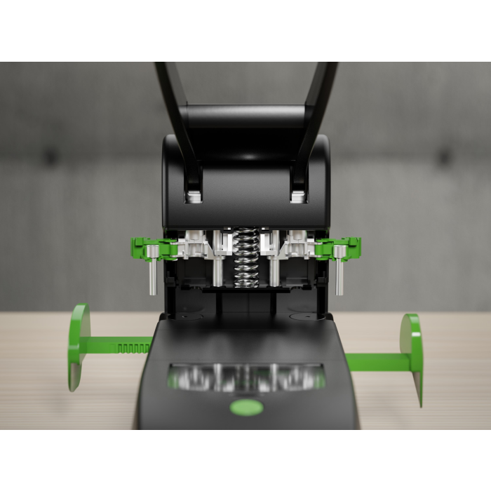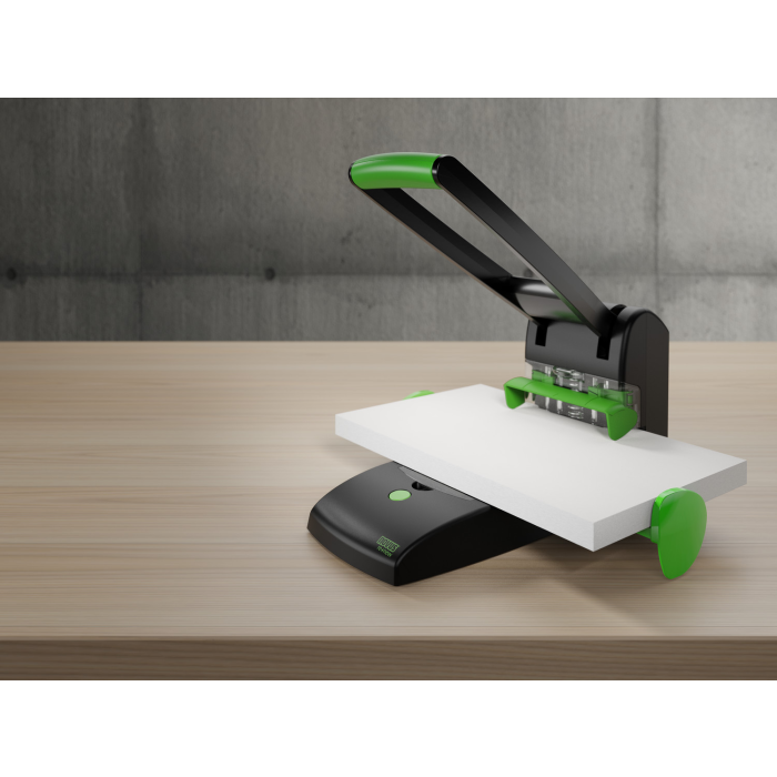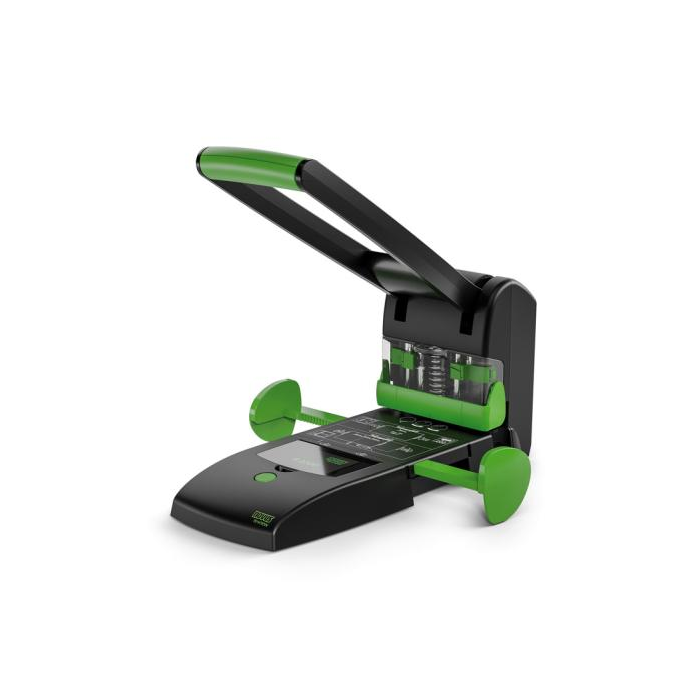 Udržateľné, vysokovýkonné dierovanie blokov 2 v 1 pre pohodlné dvojité a štvornásobné diero vanie. Automaticky centrujúci doraz papiera pre presné dierovanie. Pohyblivá nastavovacia jednotka pre pohodlné dierovanie štyroch otvorov. Celokovová s plastovým krytom vyrobeným z udržateľného recyklátu. Rozpätie dier 8 cm, priemer dier 6 mm