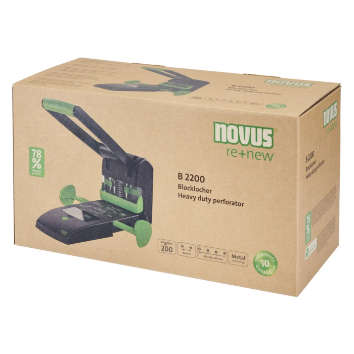 Udržateľné, vysokovýkonné dierovanie blokov 2 v 1 pre pohodlné dvojité a štvornásobné diero vanie. Automaticky centrujúci doraz papiera pre presné dierovanie. Pohyblivá nastavovacia jednotka pre pohodlné dierovanie štyroch otvorov. Celokovová s plastovým krytom vyrobeným z udržateľného recyklátu. Rozpätie dier 8 cm, priemer dier 6 mm. Záruka 10 rokov. Kapacita dierovania 200 listov. Hmotnosť cca 3500g. Farba čierna.