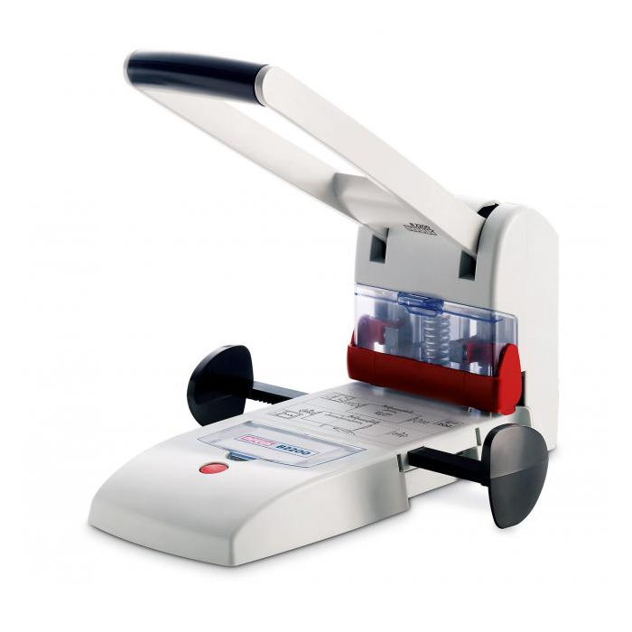 Silná bloková dierovačka sivej farby na dierovanie 2, resp. 4 otvorov s rozpätím 8 cm a jednoduchým ovládaním. Automatické centrovanie papiera, uzamknutie pozície pri dierovaní, bezpečnostný kryt prstov, ľahká výmena náhradných nožov a podložiek