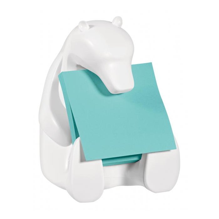Stolový dispenzor v tvare medveďa dodávaný s balením silne lepiaceho modrého Z-bločku rozmerov 76 × 76 mm, 90 listkov. Zaťažený dispenzor umožní jednoduché vytiahnutie lístka jednou rukou. Farba dispenzora biela.