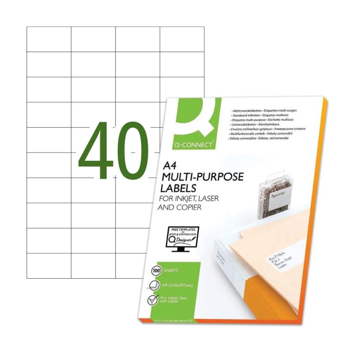 Univerzálne samolepiace etikety pre laserové a atramentové tlačiarne a kopírovacie zariadenia. Formát A4. Farba biela. Balenie 100 hárkov. Rozmery: 52,5 x 29,7 cm. Na hárka je 40 etikiet.
