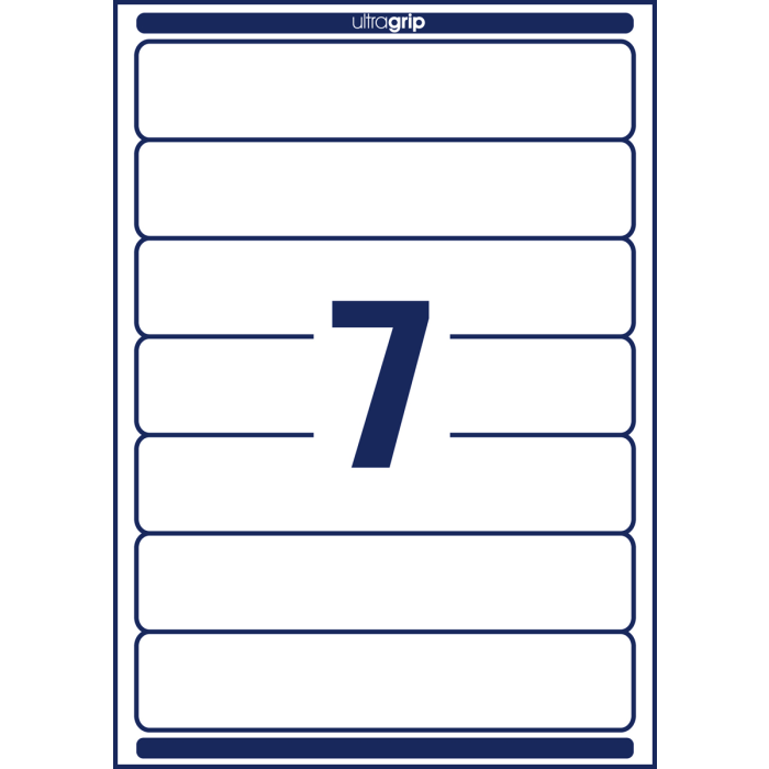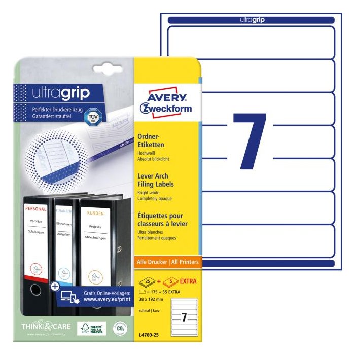 100% krycie papierové etikety na prelepenie neaktuálnych štítkov na chrbtoch zakladačov. Sú vhodné pre tlač vo všetkých druhov tlačiarní a kopíriek. Vďaka inovatívnej technológie ultragrip sa môžete spoľahnúť na bezchybné natiahnutie archu a tlač bez zasekávania. Rozmery v mm : 38 × 192. Farba biela. Etikety na hárku 7 kusov. Balenie 25 + 5 hárkov.