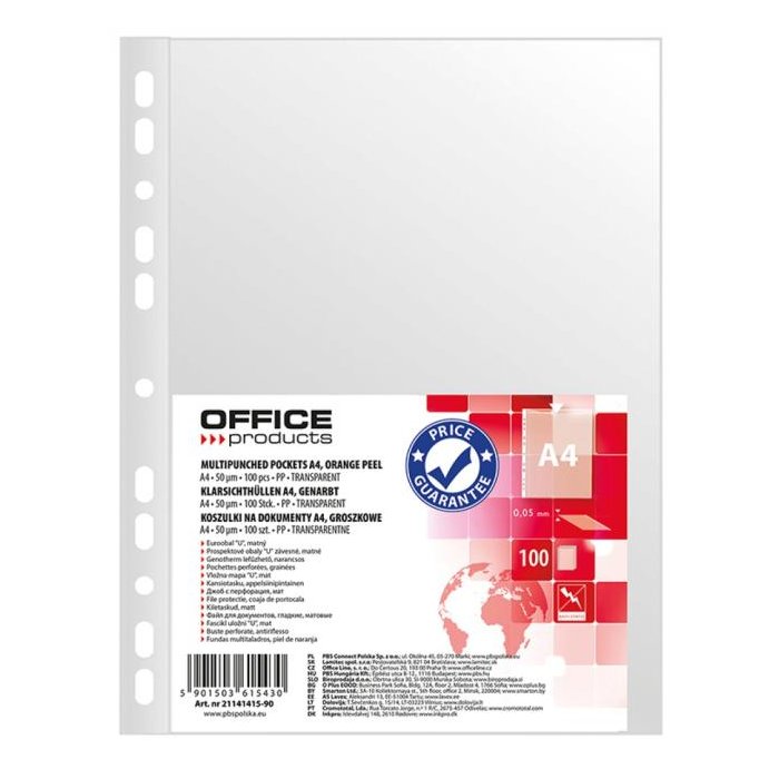Priehľadný euroobal z polypropylénu. Otvor zhora, eurodierovanie, povrch matný, mierne pórovitý. Formát A4. Balenie 100 ks v sáčku.
