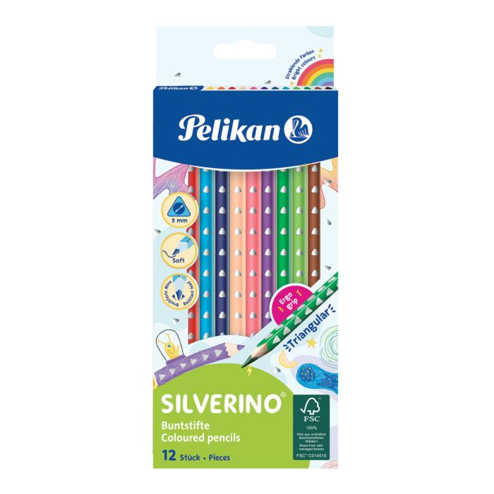 Farbičky Silverino trojhranné, tenké, so striebornými ryhami na všetkých troch stranách pre lepší úchop, priemer tuhy 4mm, s menovkou, 100% FSC drevo, balené v krabičke. Balenie 12 ks.