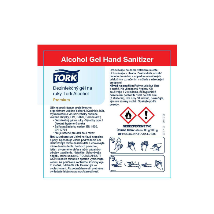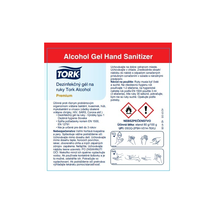Tork Alcohol gélový dezinfekčný prostriedok na ruky je účinná tekutá dezinfekcia s 80% denaturovaným alkoholom. Je ideálna tam, kde nie je po ruke voda. Nezanecháva lepkavé zvyšky ani pri častom použití.