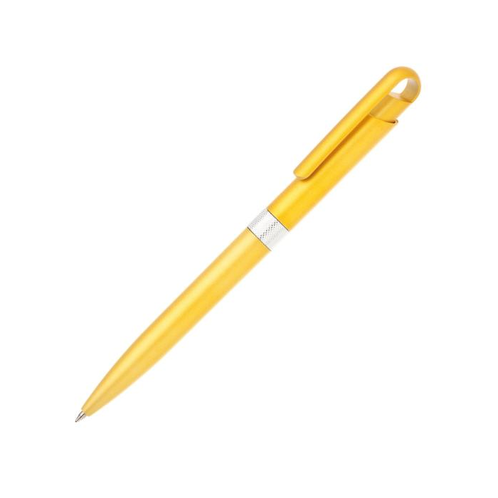 Plastové guľôčkové pero FIROL v metalických farbách. Uprostred pera je stieborný krúžok. Modrá náplň veľkoobjemová. Kolekcia DESIGN. Farba žltá.