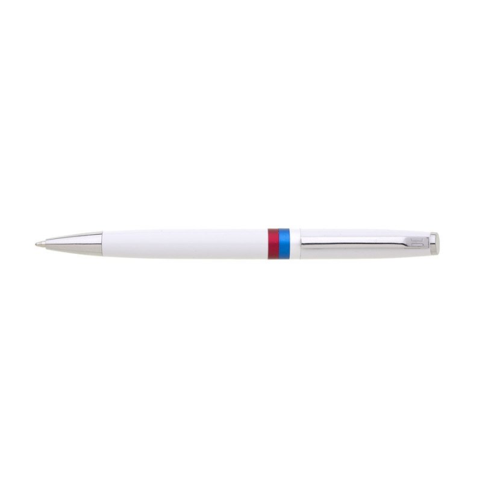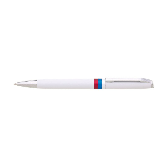 Biele guľôčkové pero REPUBLICA SK s otočným mechanizmom. Na tele je znak SR a trikolóra. Modrá náplň X-20.
