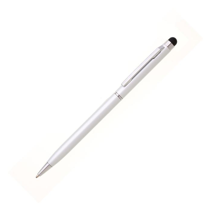 Tenké kovové guľôčkové pero s otočným mechanizmom a hrotom pre ovládanie dotykovej obrazovky. Strieborné chrómové doplnky, modrá náplň cross. Materiál hliník.
