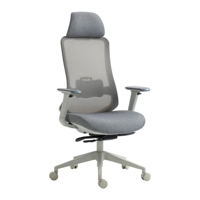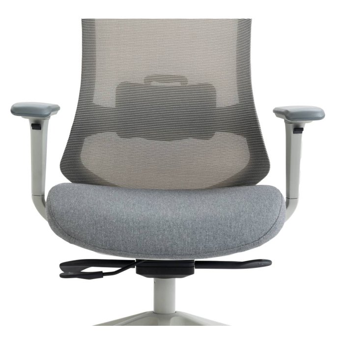 • ergonomická otočná kancelárska stolička s vysokým sieťovaným operadlom, látkovým čalúneným sedákom, opierkou hlavy a podrúčkami