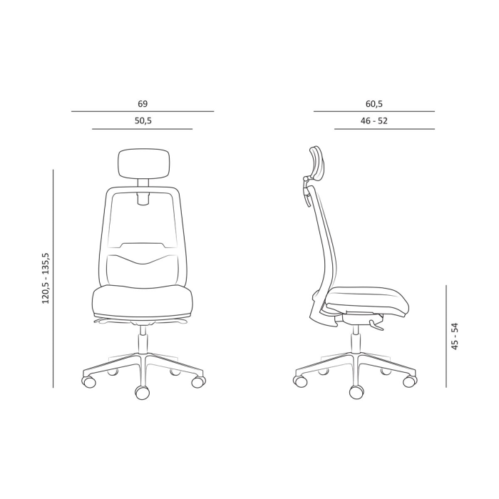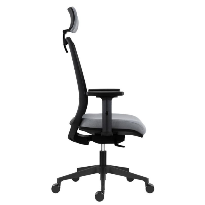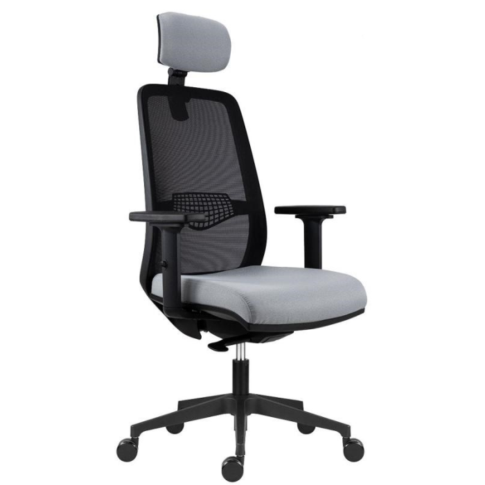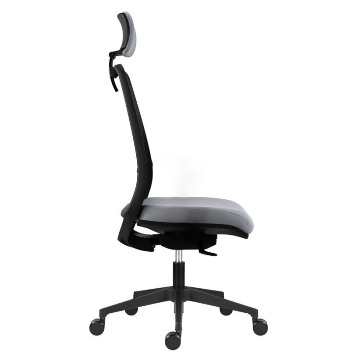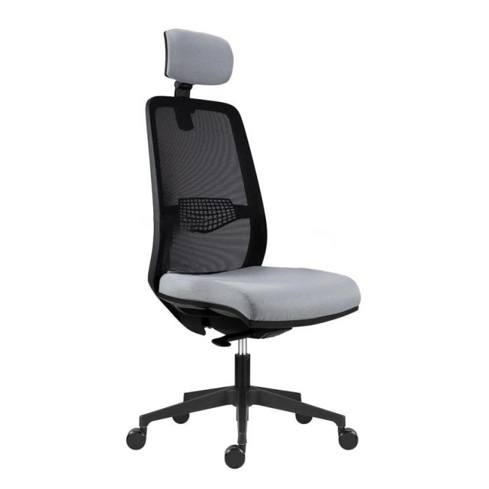 • kancelárska stolička s čiernou sieťovinou na operadle, podhlavníkom a nastaviteľnou bedrovou výstuhou