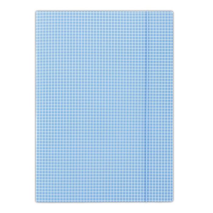 Kartonový obal vyrobený z lepenky s hmotnosťou 400g. Jednostranne potiahnutý vysoko lesklým tlačovým lakom, okrúhla vertikálna guma vo farbe obalu chráni obsah pred vykĺznutím. Károvaná potač. Formát: A4. Farba modrá. Rozmery 232 x 317 mm.