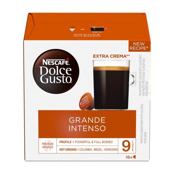 Kávové kapsule NESCAFÉ® Dolce Gusto® Grande Intenso vám ponúknu prvotriednu kvalitu, s jednoduchosťou prípravy. Stačí vložiť kapsulu do kávovaru, stlačiť tlačidlo a v zápätí máte dokonalú kávu, s hustou penou, jemnou arómou a zamatovou chuťou. NESCAFÉ® Dolce Gusto® Grande Intenso je ideálne do veľkej 180 ml šálky, v ktorej si vychutnáte dve odrody zŕn 100% arabiky, s intenzitou 9/11. Nechajte sa zviesť chuťou po tmavom ovocí pripomínajúcom čiernu čerešňu. Balenie obsahuje 16 ks hermeticky uzavretých kapsúl, na prípravu 16 šálok kávy Grande Intenso.
