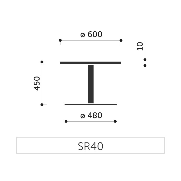 Minimalistický stolík SR 40 je navrhnutý s okrúhlou doskou, vyrobenou z tvrdeného mliečneho skla s hrúbkou 10 mm.