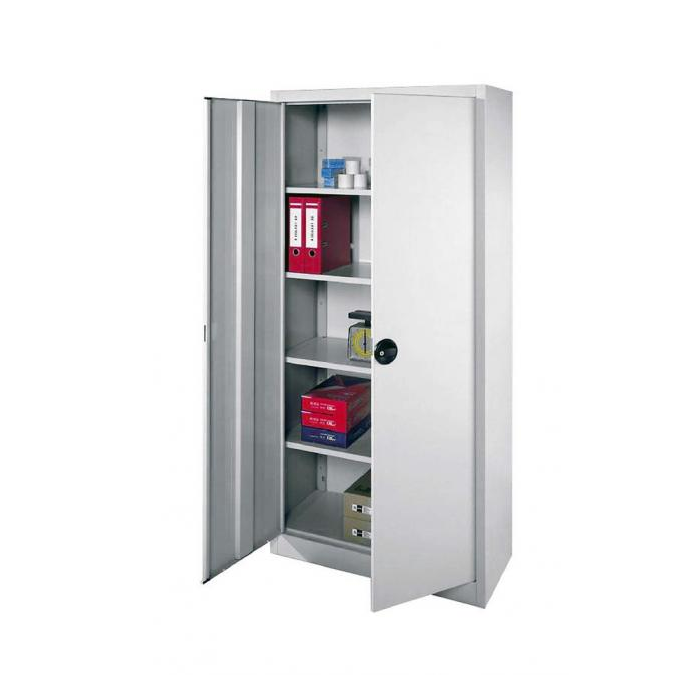 Univerzálna kovová skriňa do kancelárií, skladov a dielní. 4 nastaviteľné police s nosnosťou cca 50 kg pri rovnomernom zaťažení police, cylindrický zámok s trojcestným rozvorovým mechanizmom a 2 kľúčami. Hladká povrchová úprava vypalovaným lakom v sivom odtieni RAL 7035.