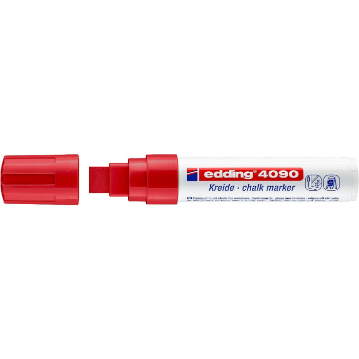 Pokiaľ ide o neprašné kriedové označenia alebo texty, sotva existuje lepšie riešenie ako kriedový popisovač edding 4090. Jeho extra široký hrot v tvare sekáča uvoľňuje vysoko nepriehľadné, tekuté kriedové farby na hladké povrchy, ako sú tabule, zrkadlá a sklo. Tento popisovač od Eddingu je vhodný nielen na kreatívne tvorenie doma, ale je aj obľúbeným nástrojom v podnikoch, ako sú reštaurácie, bary alebo sklársky priemysel.