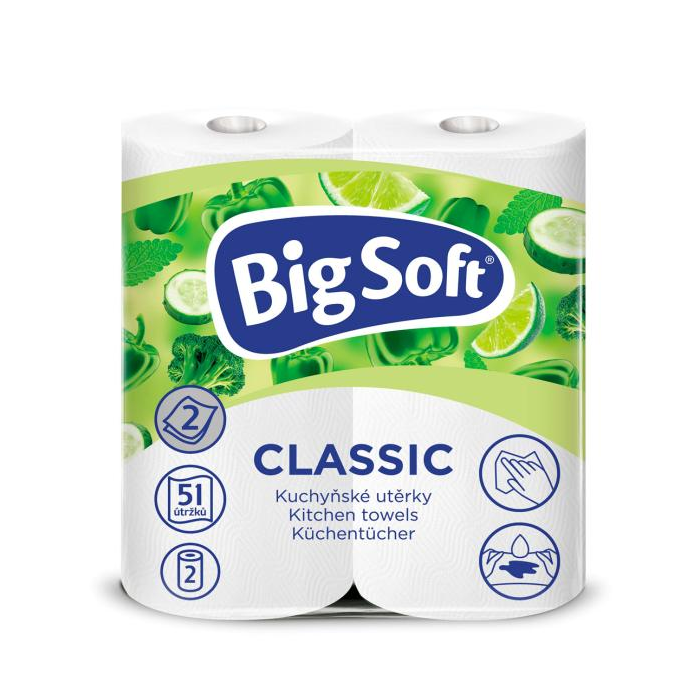 Ako už názov napovedá, je to klasika, ktorá nesmie v kuchyni chýbať. Sú vhodné na styk s potravinami, napríklad na osušenie ovocia alebo zeleniny. Vhodné sú aj na upratovanie pri varení. Vďaka pevnosti jednotlivých útržkov môžu utierky Big Soft Classic dobre poslúžiť aj pri upratovaní bytu či práci v dielni. 2 vrstvy, 51 útržkov, 100% celulóza
