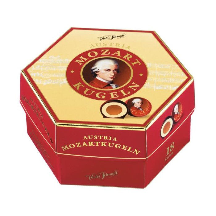 SLÁVNE MOZARTOVE GUĽKY - BONBÓNY Z HORKEJ ČOKOLÁDY S NÁPLŇOU Z KAKAA (33%) A MANDĽOVÉHO MARCIPÁNU (40%) . Svetoznáme bonbóny Victora Schmidta, ktorých názov Mozartove Gule neodmysliteľne patrí ku krajine, z ktorej pochádzajú, Rakúsku. Každá guľôčka je vyrobená z nugátu, ktorý je obalený lahodným mandľovým marcipánom. Celý bonbón je poliaty najprv mliečnou, potom horkou čokoládou. Kombinácia viacerých čokolád a marcipánu tak vytvára jedinečnú lahodnú chuť týchto výnimočných bonbónov. Hmotnosť 297 g.
