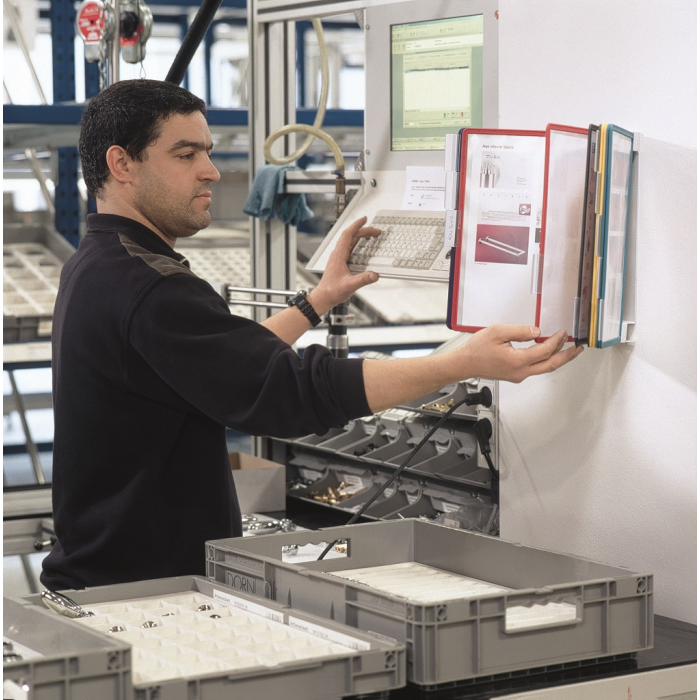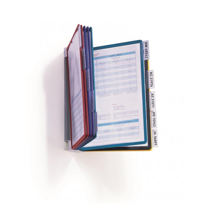 Extrémne pevný držiak na stenu vyrobený z kovovej platne s 10 displejovými polypropylénovými panelmi Sherpa s indexami. Ideálny pre použitie v priemysle, včítane dielní, skladoch, a kuchyniach. Držiak sa ľahko montuje, panely sa do držiaka jednoducho vkladajú a vyberajú. Farby panelov: po 2 ks z čiernej, červenej, žltej, zelenej a tmavomodrej pri 10 paneloch.