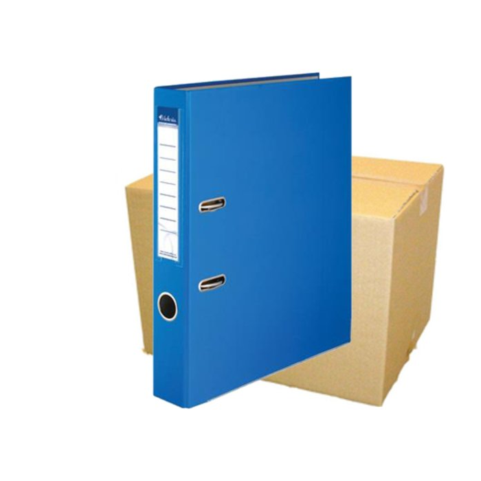 Predajné len kartónové balenie = 25 ks, materiál kartón potiahnutý PP fóliou, umývateľný povrch, s ochrannou spodnou lištou, pákový mechanizmus, RADO zámok, nalepený chrbtový štítok, modrá farba, rozmery 50 × 318 mm (Š×H)
