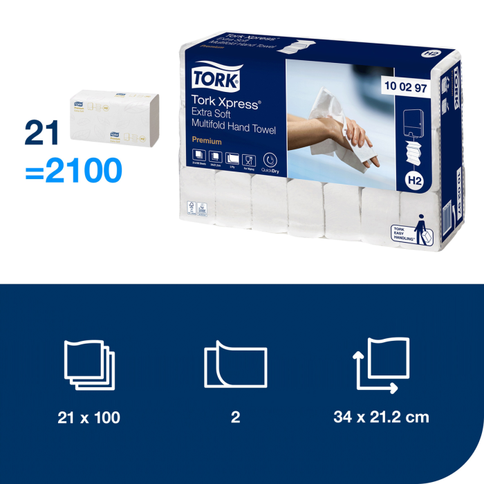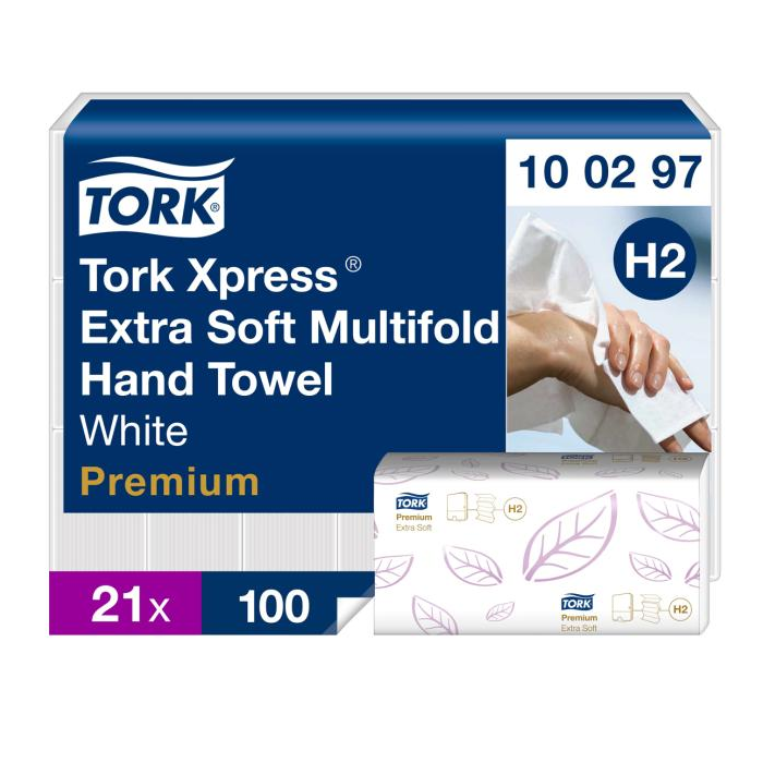 Doprajte si výnimočné sušenie rúk a pohodlie s veľkými a extra mäkkými Tork Xpress® jemnými papierovými utierkami na ruky Extra Soft Multifold Premium. Utierky sú vhodné do Tork Xpress® zásobníka systému H2 na papierové utierky Multifold v stredne frekventovaných toaletách a umyvárňach. Možno ho použiť do malých priestorov a vašim hosťom poskytuje pohodlie aj hygienu.