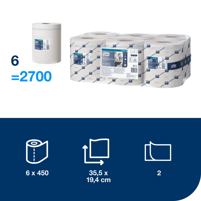 Dvojvrstvová viacúčelová papierová utierka Tork Reflex™ Plus je ideálna na utieranie tekutín a ručné utieranie. Túto papierovú utierku možno použiť v Tork Reflex™ zásobníku so stredovým odvíjaním na dávkovanie po jednom útržku, ktorý vyhovuje vašej tímovej práci, znižuje spotrebu a minimalizuje riziko krížovej kontaminácie.