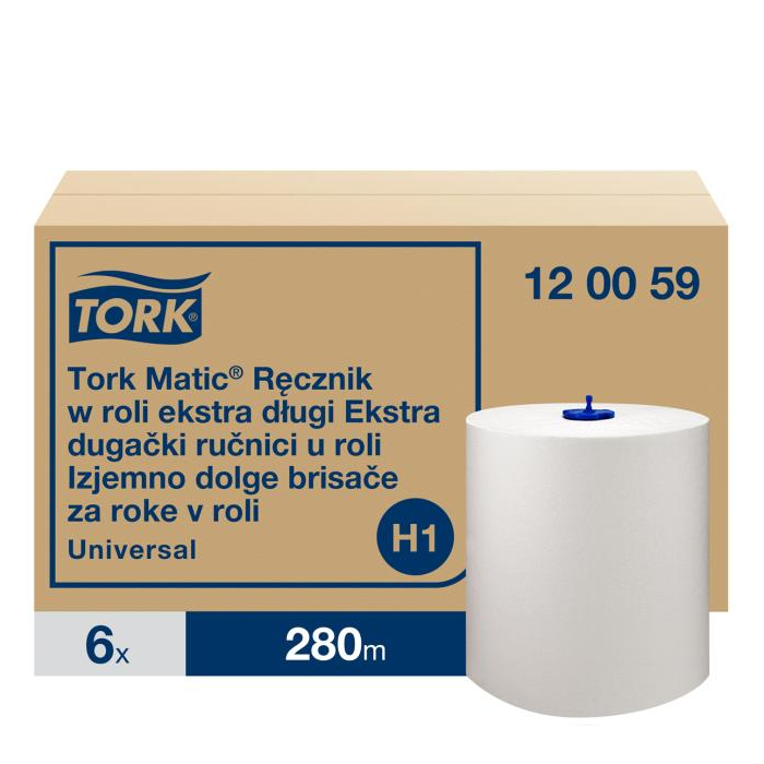 Tork 120 059 Matic® systém kotúčov utierok na ruky (H1) má vysokú kapacitu ideálnu do frekventovaných toaliet a umyvární v školách a na letiskách.