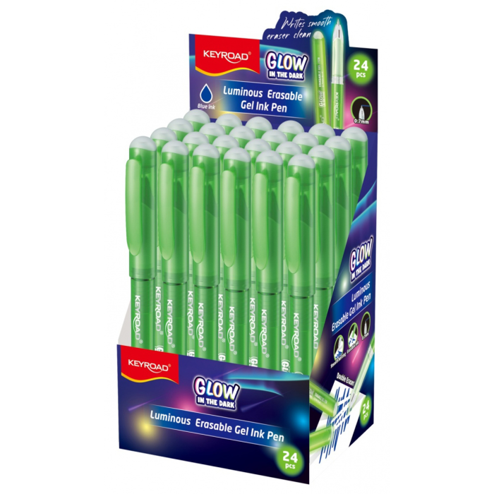 Unikátne svietiace zmazateľné pero KEYROAD Dokonalá kombinácia inovácie a funkčnosti Dvojitá guma na viečku aj na konci valca uľahčuje opravu textu S fluorescenčným valcom, ktorý svieti v tme Hrot s hrúbkou 0,7 mm zaisťuje mimoriadne plynulé písanie Modrý gélový atrament Balenie: Balenie po 24 kusoch Farba: Zelená