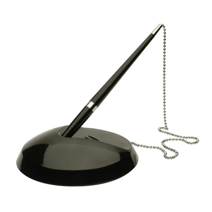 Plastové pero na stojane s prilepovacou základňou, spojené 58 cm retiazkou. Dodávané s čiernou náplňou a 2 náhradnými náplňami