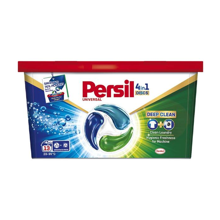 Persil kapsuly 4v1 Discs Universal - Zažite hĺbkovo čistú bielizeň a hygienicky sviežu práčku vďaka jedinečnému zloženiu Persil. Výkonná štvorkomorová gélová kapsula Persil je teraz kompaktovaná pre vynikajúci výkon a nižší dopad na životné prostredie vďaka nižšiemu množstvu použitých materiálov.
