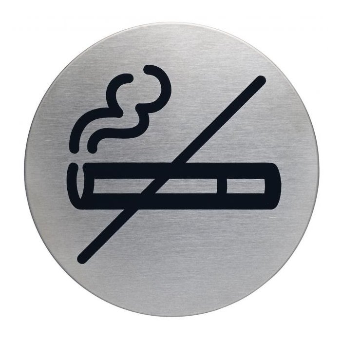 Piktogram na vysoko kvalitnej brúsenej nehrdzavejúcej oceli. Vytlačený symbol je odolný voči poškriabaniu a silnému opotrebeniu. Priemer 83 mm, vďaka lepiacej páske na zadnej strane sa piktogram dá použiť na rôzne povrchy. Farba strieborná, potlač čierna.