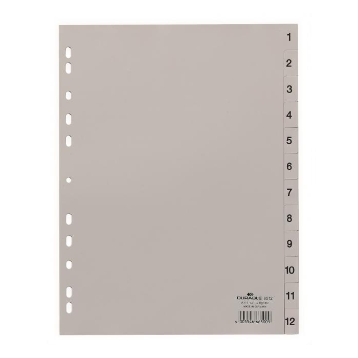 Číselný rozraďovač z polypropylénu. Formát A4, euro-dierovanie. Balenie jedna sada v polyesterovom sáčku. Väčšie balenie 25 sád. Farba sivá.