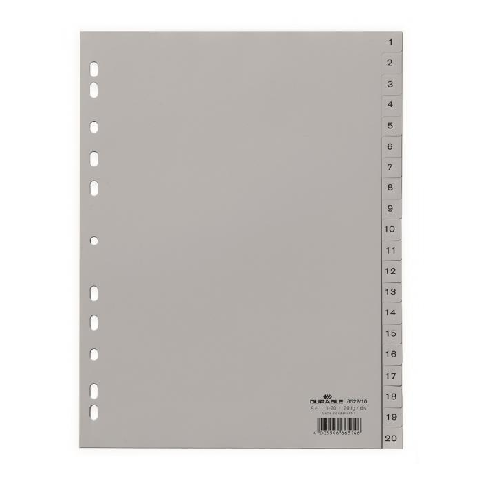Číselný rozraďovač z polypropylénu. Formát A4, euro-dierovanie. Balenie jedna sada v polyesterovom sáčku. Väčšie balenie 20 sád. Farba sivá.