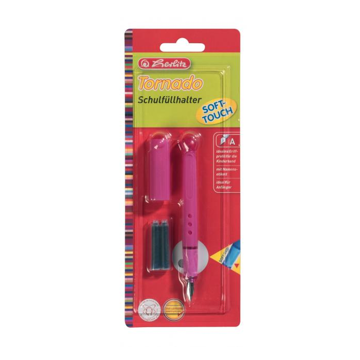 Plniace bombičkové pero A - Tornado - pre pravákov začiatočníkov, hrot z ušľachtilej ocele, ergonomické pogumované držanie, nálepka s menom, balenie v blistri, mix farieb.