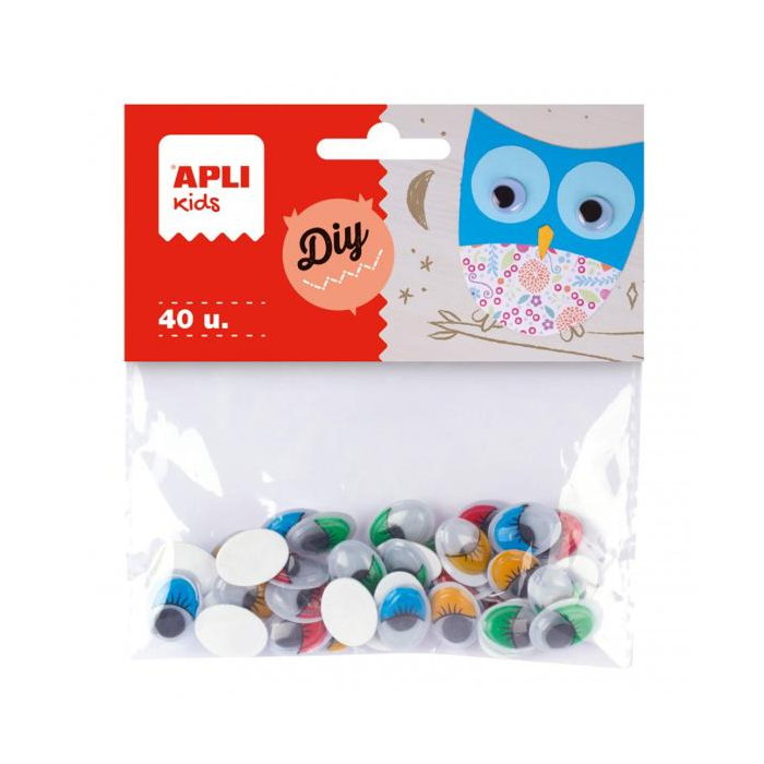 Oválne pohyblivé oči v rôznych farbách: zelená, modrá, červená a žltá. Rozmery: 16 x 12 mm. Každé vrecko obsahuje 40 očí. Oči s lepidlom na zadnej strane, pripravené na použitie. Silná priľnavosť na mnohých povrchoch: papier, kartón, EVA pena, plast, keramika alebo sklo. Základný produkt pre školy a detské dielne, ideálny na doplnenie do kresieb, bábok alebo iných ručných prác.