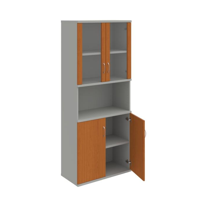 Kombinovaná skriňa - dvere/nika. Kancelárske skrine STRONG majú robustnú konštrukciu a vyššiu nosnosť políc ako bežné kancelárske skrine.V ponuke sú skriňové moduly s výškou 185 cm, 111 cm alebo 74 cm a šírky 80 cm alebo 40 cm. Hĺbka všetkých modelov skriňového radu STRONG je 40 cm.Chrbát, vyrobený z 8 mm hrubých dosák, je obojstranne pohľadový, takže skrine môžete použiť ako priestorový deliaci prvok. Hrúbka samotných políc je 25 mm, čo znamená nosnosť 80 kg na 1 policu.Korpusy, dvierka a police skríň sú olepené odolnou 2mm ABS hranou, ktorá garantuje dostatočnú ochranu proti poškodeniu.
