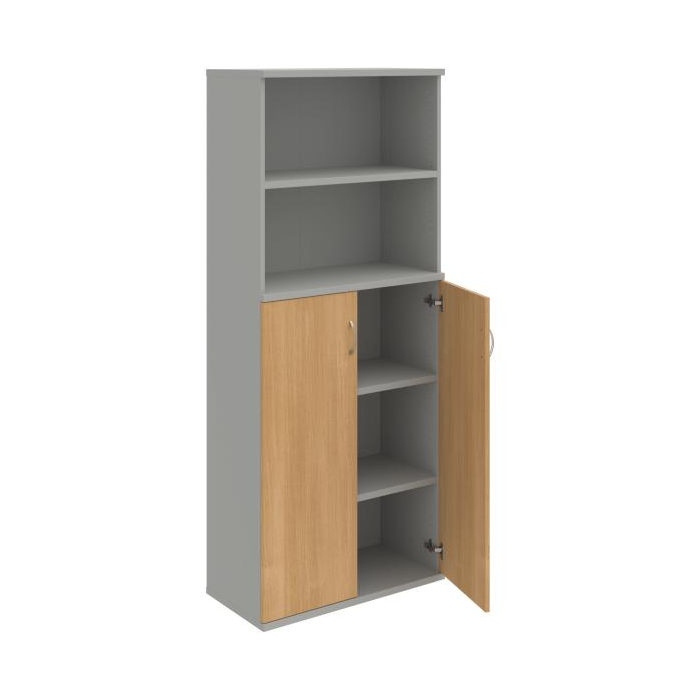Kombinovaná skriňa - dvere/nika. Kancelárske skrine STRONG majú robustnú konštrukciu a vyššiu nosnosť políc ako bežné kancelárske skrine.V ponuke sú skriňové moduly s výškou 185 cm, 111 cm alebo 74 cm a šírky 80 cm alebo 40 cm.Hĺbka všetkých modelov skriňového radu STRONG je 40 cm.Chrbát, vyrobený z 8 mm hrubých dosák, je obojstranne pohľadový, takže skrine môžete použiť ako priestorový deliaci prvok. Hrúbka samotných políc je 25 mm, čo znamená nosnosť 80 kg na 1 policu.Korpusy, dvierka a police skríň sú olepené odolnou 2mm ABS hranou, ktorá garantuje dostatočnú ochranu proti poškodeniu.
