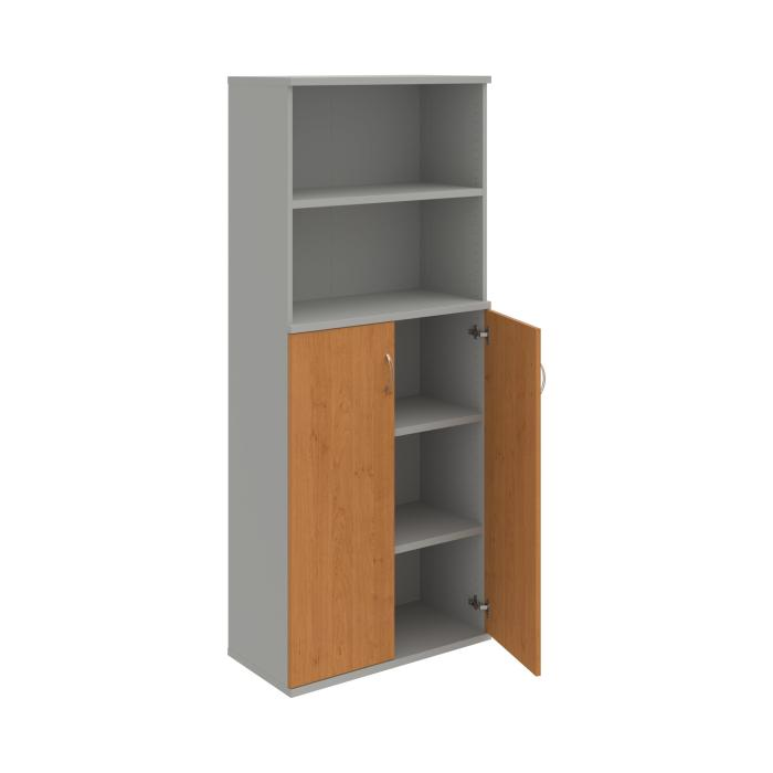 Kombinovaná skriňa - dvere/nika. Kancelárske skrine STRONG majú robustnú konštrukciu a vyššiu nosnosť políc ako bežné kancelárske skrine.V ponuke sú skriňové moduly s výškou 185 cm, 111 cm alebo 74 cm a šírky 80 cm alebo 40 cm.Hĺbka všetkých modelov skriňového radu STRONG je 40 cm.Chrbát, vyrobený z 8 mm hrubých dosák, je obojstranne pohľadový, takže skrine môžete použiť ako priestorový deliaci prvok. Hrúbka samotných políc je 25 mm, čo znamená nosnosť 80 kg na 1 policu.Korpusy, dvierka a police skríň sú olepené odolnou 2mm ABS hranou, ktorá garantuje dostatočnú ochranu proti poškodeniu.