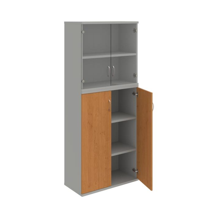 Kombinovaná skriňa - dvere/nika. Kancelárske skrine STRONG majú robustnú konštrukciu a vyššiu nosnosť políc ako bežné kancelárske skrine.V ponuke sú skriňové moduly s výškou 185 cm, 111 cm alebo 74 cm a šírky 80 cm alebo 40 cm. Hĺbka všetkých modelov skriňového radu STRONG je 40 cm.Chrbát, vyrobený z 8 mm hrubých dosák, je obojstranne pohľadový, takže skrine môžete použiť ako priestorový deliaci prvok. Hrúbka samotných políc je 25 mm, čo znamená nosnosť 80 kg na 1 policu.Korpusy, dvierka a police skríň sú olepené odolnou 2mm ABS hranou, ktorá garantuje dostatočnú ochranu proti poškodeniu.