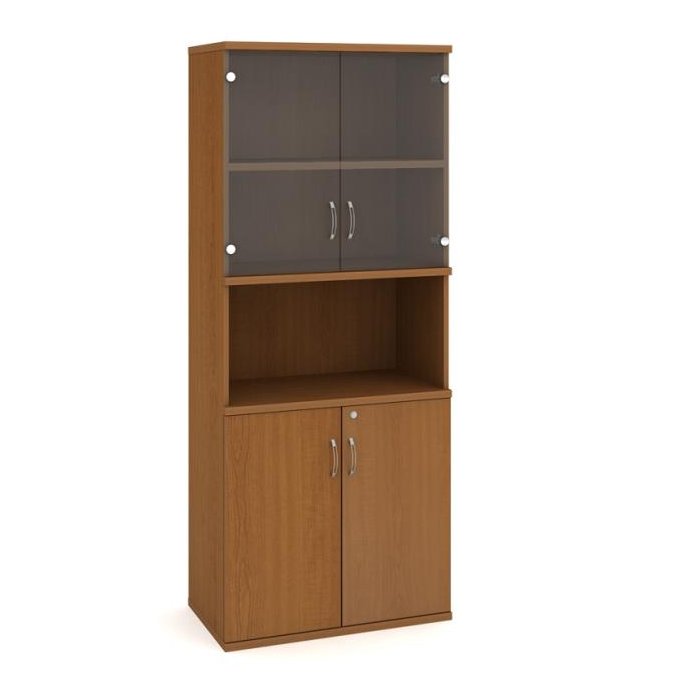 Kombinovaná skriňa - dvere/nika. Kancelárske skrine STRONG majú robustnú konštrukciu a vyššiu nosnosť políc ako bežné kancelárske skrine.V ponuke sú skriňové moduly s výškou 185 cm, 111 cm alebo 74 cm a šírky 80 cm alebo 40 cm. Hĺbka všetkých modelov skriňového radu STRONG je 40 cm.Chrbát, vyrobený z 8 mm hrubých dosák, je obojstranne pohľadový, takže skrine môžete použiť ako priestorový deliaci prvok. Hrúbka samotných políc je 25 mm, čo znamená nosnosť 80 kg na 1 policu.Korpusy, dvierka a police skríň sú olepené odolnou 2mm ABS hranou, ktorá garantuje dostatočnú ochranu proti poškodeniu.