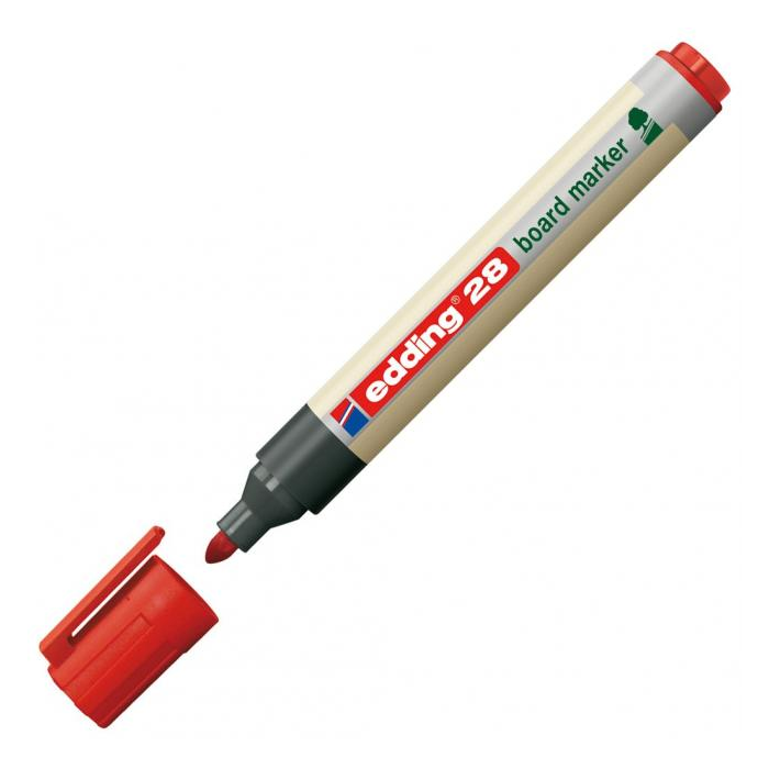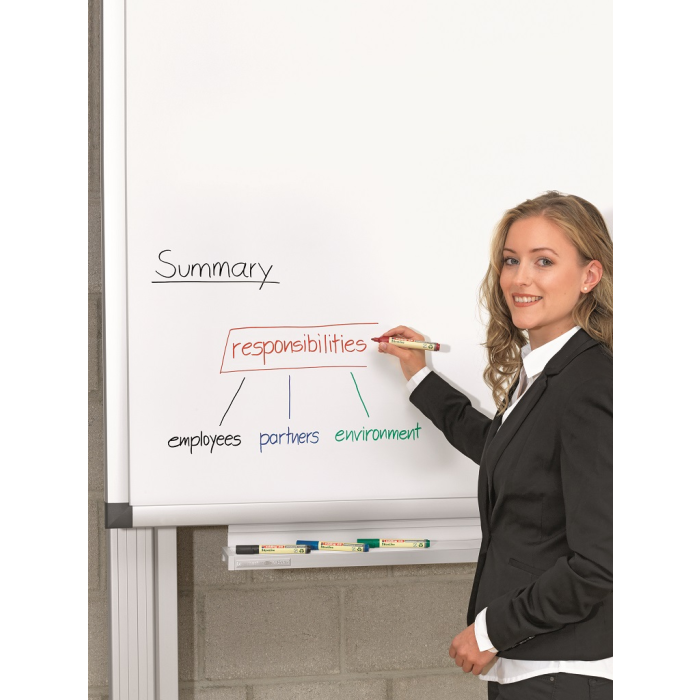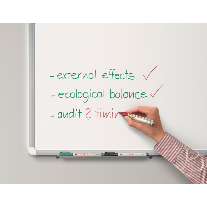 Popisovač na biele tabule, za sucha stierateľný prakticky zo všetkých neporóznych povrchov, ako je keramická úprava, melamín i sklo. Minimálne 80 % plastovej časti je vyrobených z recyklovaného materiálu. Okrúhly hrot, šírka stopy 1,5 - 3 mm. Rýchloschnúci, vodeodolný, slabo zapáchajúci atrament intenzívnej farby. Krátky čas vydrží neuzavretý bez vyschnutia. Väčšie balenie 10 ks.