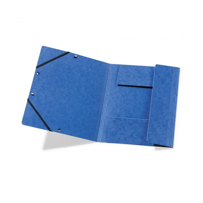 Obal A4 s tromi chlopňami a dvomi gumičkami čiernej farby. Materiál prešpánový kartón gramáže 355 g / m². Väčšie balenie 25 ks. Farba modrá.