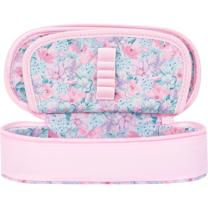 Vodeodolná polyesterová tkanina, kvetinová podšívka vo vnútri puzdra. Klopa s integrovaným vreckom a pútkami na pero. Hlavné vrecko na zips. Rozmery 23,5 x 8,5 x 5 cm.