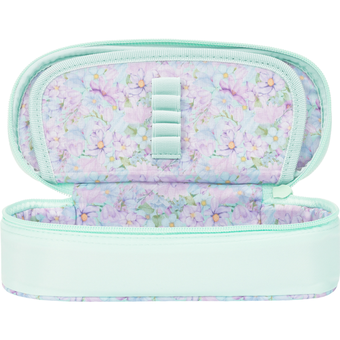 Vodeodolná polyesterová tkanina, kvetinová podšívka vo vnútri puzdra. Klopa s integrovaným vreckom a pútkami na pero. Hlavné vrecko na zips. Rozmery 23,5 x 8,5 x 5 cm.